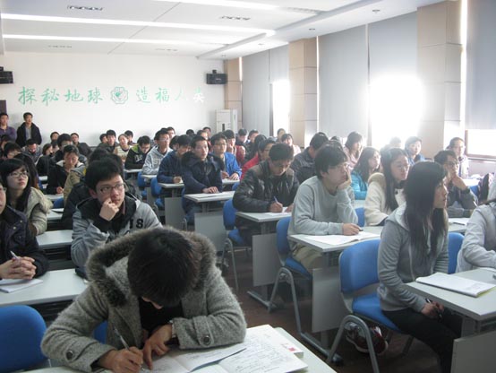 2013年3月6日下午4:00博士郑虎在地学院报告厅作了《密集颗粒系统拟静态剪切特性试验研究》的报告。 报告围绕光弹颗粒剪切特性试验和水凝胶颗粒堆积体试验展开。光弹颗粒剪切特性试验是利用自研的光弹装置来研究颗粒的受力、变形。对水凝胶颗粒堆积体试验,郑虎介绍了试验选材、设计等各个因素,利用丰富的视频资料进行讲解,形象生动、简明易懂。最后,他还介绍了几个光弹试验在岩土工程、地质工程中的应用,如应力诱导各向异性和颗粒物质的剪切带、粘滑模型――地震等。同学们听了报告后,积极提问,踊跃交流。 | 郑虎博士的报告使同学们受益匪浅,郑虎博士的钻研精神也使同学们深受鼓舞。