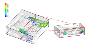 2014年4月1日,在公司报告厅窦智博士做了《裂隙介质中非水相液体(NAPL)行为及其界面面积演变规律》学术报告,讲述了粗糙单裂隙的水流及溶质运移实验与模拟;充填单裂隙NAPL排水过程中的相对渗透率变化规律;充填物分布对穿透曲线及相对渗透率影响的LBM模拟;三维粗糙裂隙NAPL入侵过程中有效界面面积演变规律(见附图),重点介绍了博士阶段主要研究内容。 窦智博士主要研究VGM和BCB经验公式在充填裂隙中的适用条件;针对粗糙单裂隙和裂隙充填物分布形式对水流、溶质和NAPL运移过程的影响,将LBM应用到研究二维和三维裂隙介质水流、溶质和NAPL运移;微观尺度下不同湿润性条件下的NAPL侵入过程模拟,以获得不同湿润性条件下的有效界面面积演变规律,并发表了5篇SCI、3篇EI,申请了6项发明专利、1项实用新型专利。钱卫教授就我国目前NAPL污染地下水的现状以及修复技术、运用地球物理手段对NAPL污染进行准确定位的可行性等问题与师生们进行了讨论。