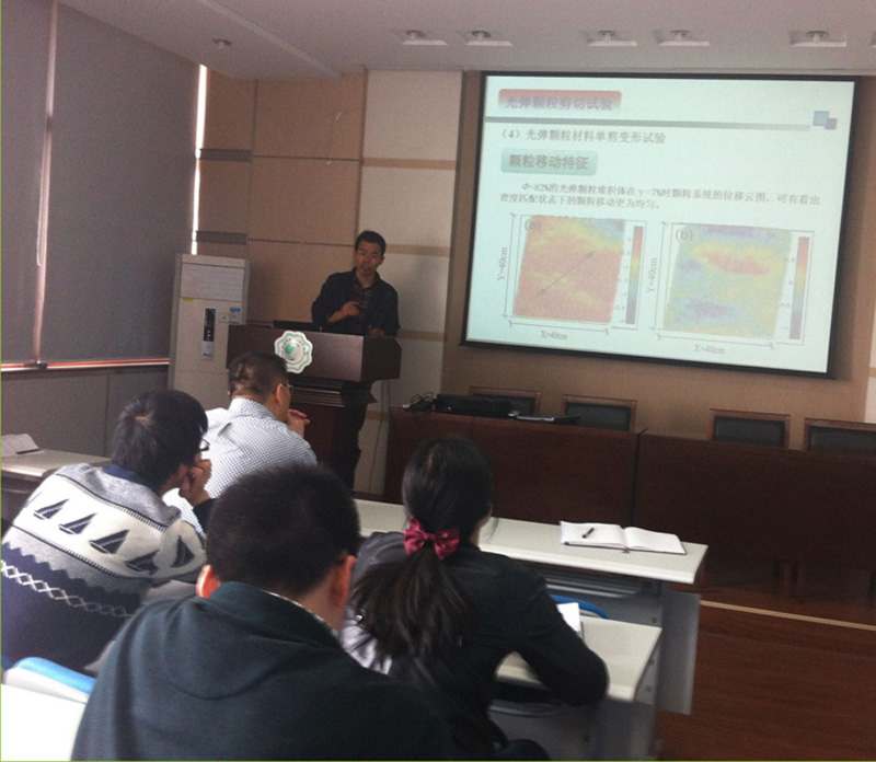 2014年4月28日,郑虎老师在公司报告厅做了《基于数字图像技术的颗粒材料变形性状研究》学术报告,他首先介绍了颗粒材料的研究意义,颗粒材料是由大量离散的固体颗粒所组成的宏观体系,是自然界中存在最为广泛的物质,约有75%的原材料属于颗粒物质。颗粒物质的离散决定了其变形的复杂性,许多自然现象和地质灾害的发生都与颗粒材料的变形性状有关。并介绍了目前在二维和三维空间内研究颗粒材料变形特性的前沿试验方法:光弹颗粒材料试验和基于折射率匹配的成像试验。 郑虎博士毕业于同济大学地下建筑与工程系,主要研究岩土颗粒材料变形特性以及由岩土颗粒材料变形诱发的相关地质灾害的防治研究。