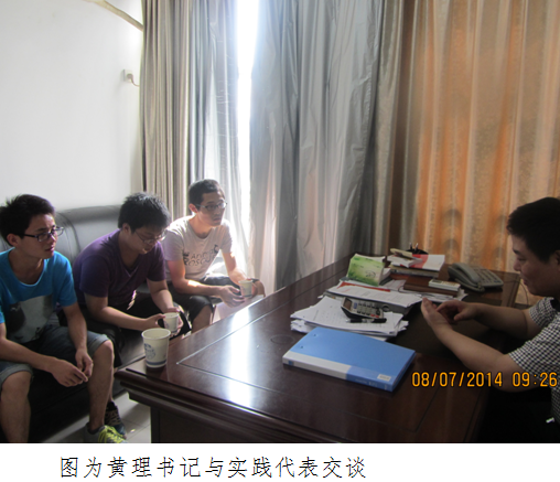 之后实践小组的几位代表同黄理书记就水利知识和水利建设等方面进行了一翻交流,黄理书记深表水利人才的缺乏,希望实践成员能学好知识,为水利做出贡献。国家近几年大力发展水利工程,水利人的任务艰巨。实践小组就水利建设的难度,水利建设的效应,水利建设对农业,对经济的影响等相关问题对黄理书记进行了询问,黄理书记热情的与实践小组交谈分享了在水利工作方面的经验,并做了举例。  在与实践代表交谈之后,黄理书记到会议厅与实践小组所有成员亲切交谈,现场气氛活跃,实践成员都就各自关心的问题与黄理书记大方交流,黄理书记认真回答了各位同学的问题,并勉励大家要好好学习,为国家的水利建设尽一份力。 |