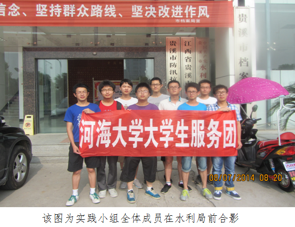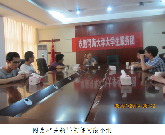 赴贵溪市暑期实践第三天 7月8号,地学院暑期实践小分队赴贵溪市水利局参观学习,水利局党委黄理副书记热情地接待了实践小组的成员。实践小组希望借此机会加深对贵溪市水利建设的了解,学习水利人的精神。 黄理书记先安排我们在会议厅,让实践小组先休息一会儿。因为工作关系,黄理书记未能立刻招待我们,所以相关领导为实践小组成员先介绍了贵溪市的水利水情。了解到,贵溪一共有十余个中型水库,若干个一型和二型水库。主要河流有信江,罗塘河,泗沥河等。水库灌溉了许多农作物,减轻了洪水或干旱对农业的损害,保障了农业的发展。