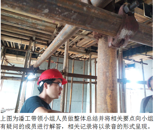 随后,大家跟随潘工脚步进入在建楼盘参观其内部结构,大家了解了楼梯的交叉设计是为了当发生火灾时保证人员能迅速撤离,了解了电梯的初期基本框架,以及一系列住房中的各项设计,虽然在工地中行走比较困难,队员们还是一起完成了所有的过程。