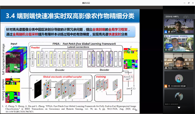报告针对我国土地利用细碎化的特点,以高光谱农作物精细分类为研究背景,从标准数据集、深度学习模型和农业遥感应用三个角度,介绍了无人机高光谱高空间(双高)遥感影像农作物精细分类的相关研究进展。针对双高影像传统空谱分类方法的局限性,借鉴深度学习的思想,提出了基于卷积神经网络融合深层次空谱特征和基于Patch的深度学习高光谱分类方法。针对深度学习分类方法在双高影像农作物分类中面临的问题,提出全局空谱融合双高影像农作物分类方法和端到端快速准实时双高影像农作物精细分类方法,有效地提高了分类精度和计算效率,以上方法在WHU-Hi数据集中取得了良好的分类效果。此外,钟教授针对高光谱农作物精细分类提出三点建议:构建基准数据集、优化分类模型、扩展算法应用。最后,在互动环节,钟教授耐心解答了同学们的疑问,也给同学们今后的研究提了有效的建议。