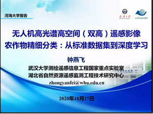 2020年10月27日下午,应测绘科学与工程系苏红军教授邀请,武汉大学测绘遥感信息工程重点实验室钟燕飞教授作了题为《无人机高光谱高空间(双高)遥感影像农作物精细分类:从标准数据集到深度学习分类》的线上学术报告。本次报告由测绘科学与工程系苏红军教授主持,公司师生共140多人参加了线上学术报告。