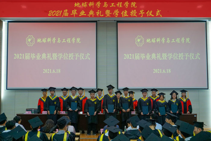 毕业典礼上,地学院学位评定分委员会的老师向毕业生颁发毕业证书以及学士学位证书。