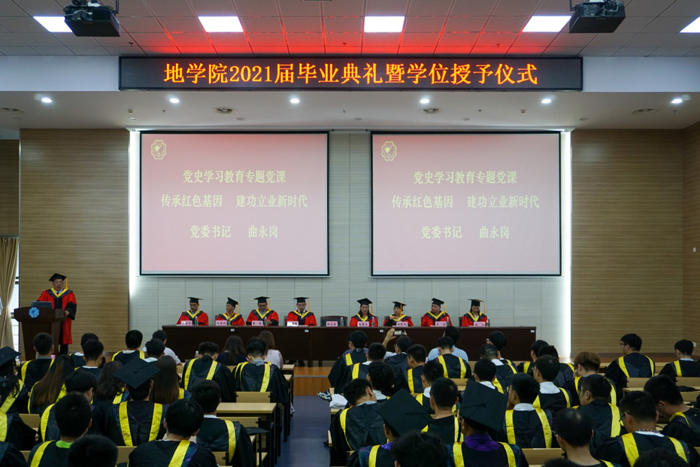 为充分发挥典礼仪式育人作用,进一步增强毕业生爱水、爱校、爱院意识。betway西汉姆联于2021年6月18日隆重举行2021届毕业典礼暨学位授予仪式。学院经理王锦国,党委书记曲永岗,副经理杨英宝,副经理窦智,党委副书记杨天,各系主任,地学院学位评定分委员会老师,毕业班班导师以及160余名毕业生参加了典礼。茅昌平副经理主持典礼。