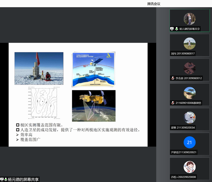 2021年11月06日上午,应公司测绘科学与工程系徐佳副教授邀请,杨元德副教授作了题为《基于卫星大地测量的冰川/冰盖监测》的线上学术报告。本次报告会由徐佳副教授主持,公司师生共200余人参加了线上学术报告会。