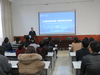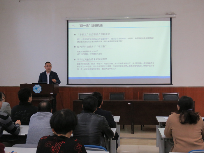 王锦国经理以《立足服务国家战略,聚焦学科特色发展》为题,重点围绕“双一流”建设机遇、加大引才育才力度、聚焦国家战略急需提出要求。王锦国经理一方面分析了学院两个省重点学科的建设目标与“十四五”期间国家战略急需领域的对接关系,指出学科交叉融合是未来发展趋势;另一方面分析了学院目前的人才储备、面临的问题,提出2022年引才育才目标和措施。同时聚焦国家战略需求,结合“十四五”规划和2035年远景目标纲要相关需求以及江苏省“十四五”水利发展规划分析了学院在科研工作方面存在的问题,提出解决措施。王锦国经理布置了开展《关于深入推进世界一流大学和一流团队建设的若干意见》学习活动的工作。