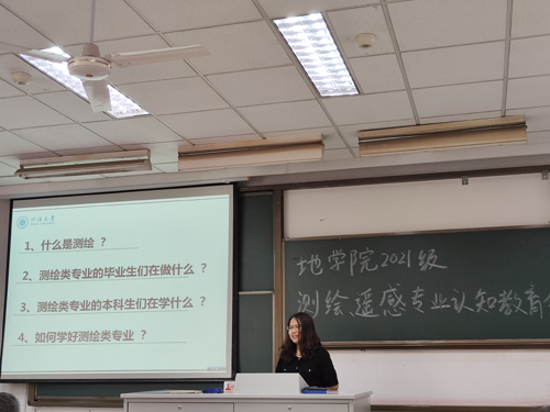 徐佳老师结合自身的经历向同学们介绍了测绘学科的就业情况,分析了测绘遥感专业良好的就业前景及与高新技术密切的关联,希望同学们和老师多多交流,对测绘学科更加深入了解并发掘兴趣,具体规划学习及就业生涯,努力在日后学习中获得更高成就。