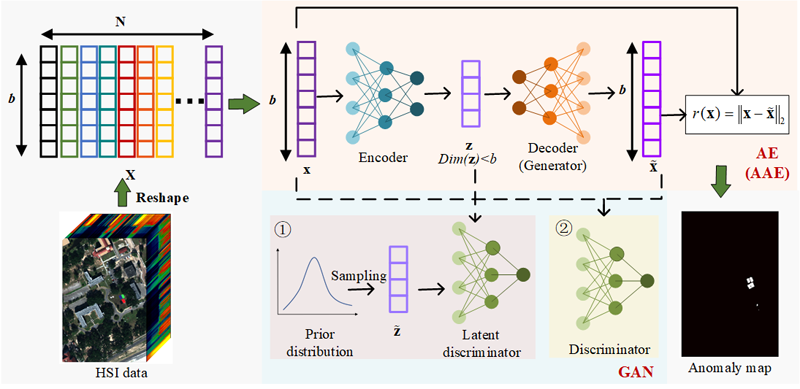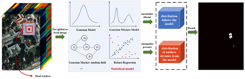 高光谱遥感影像异常探测是利用高光谱遥感影像蕴含的丰富空谱信息对地物进行精细识别的技术,是当前的研究热点和难点问题,已广泛应用于边境监测、伪装目标识别、稀有矿物探测、森林火灾等军民领域。该文从异常探测机理、探测算法模型(部分算法见图1-图4)、性能评价指标、常用数据集和应用研究等方面,系统归纳了近年来高光谱遥感影像异常探测领域的最新研究成果,探讨了高光谱遥感异常探测当前面临的挑战和未来发展趋势。