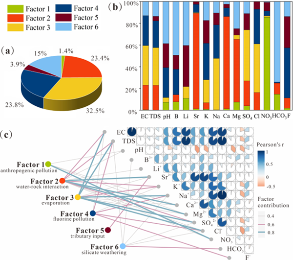图3 (a) PMF因子指纹图,(b) PMF因子贡献图,(c) PMF因子贡献与地下水化学组分的相关性