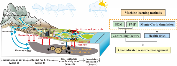 地下水在高寒干旱区供水和生态维护中发挥重要作用。然而,人为物质排放对该区域地下水质量构成潜在威胁,地下水资源面临严峻挑战。开展高寒干旱区地下水质量和风险评价是一项极为紧迫的研究课题,对当地地下水资源管理有显著的现实指导意义。本研究利用机器学习方法,创新性地研究了青藏高原北部的格尔木河流域地下水化学控制因素、来源贡献和潜在健康风险。研究发现水岩作用、蒸发作用和人为活动对地下水的贡献分别为达到了38%、32.5%和25.2%,凸显了人为输入的重要影响。概率健康风险评估进一步表明,F−对人类健康的非致癌风险大于Sr2+、B3+、和NO3−,在旱季对儿童的潜在威胁比其他季节更为显著。这些发现有助于管理部门对格尔木流域地下水资源保护和管理的精准决策。