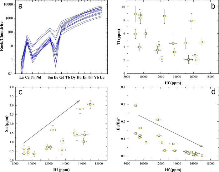 图2 卡房高分异花岗岩锆石微量元素图解