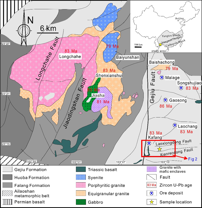 本研究以全球最大锡矿个旧矿集区内铜矿化最显著的卡房成矿花岗岩为研究对象,对这些花岗岩开展了系统的岩相学、主微量、Nd同位素、黑云母电子探针、锆石U-Pb年代学、微量元素及Hf-O同位素研究,限定了这些岩浆的源区组成、演化细节、氧逸度及形成的构造背景,讨论了其与锡铜矿化之间的成因联系。