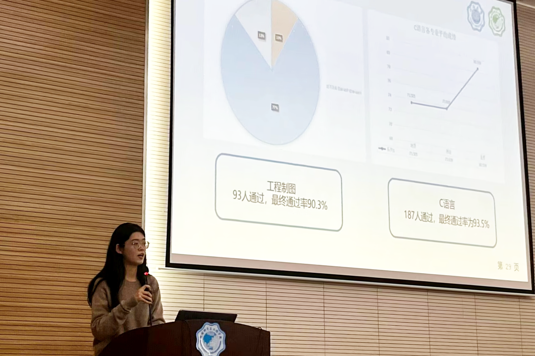 使同学们了解年级整体情况有助于使同学们形成你追我赶、良性竞争、共同进步的的氛围。会议的第二部分,辅导员庞若昕老师主要从学风建设、重点事项梳理及日常事项三个方面展开,首先通过具体的各科成绩分析总结了上学期2022级的学习情况,从补考成果、整体通过率对比等方面肯定了上学期的成就,但也提出目前各专业存在两极分化、晚自习学习状态懈怠等情况,向同学们作出了新学期的学风建设要求。