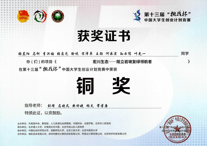 经过多轮激烈的竞争,由公司与大禹学院共同推报的项目“宏川生态——陡立岩坡复绿领航者”获得全国铜奖。地学院在“挑战杯”中国老员工创业计划竞赛中取得国家级奖项的从零突破,彰显出公司师生在创新创业系列竞赛中的不断探索与锐意进取。