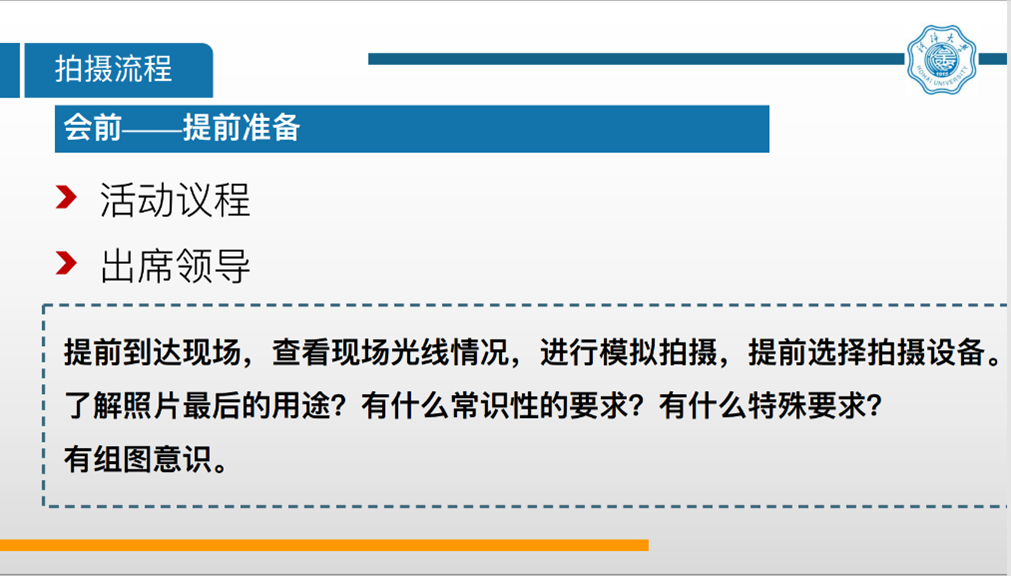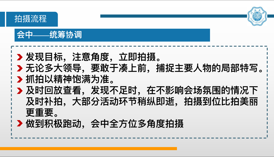 田妍同学围绕主题“各类场景拍摄技巧”首先提出为什么要学习拍摄技巧,接着讲述了“拍摄流程”,“拍摄误区”,“会场、领导、观众三要素”和“曝光三要素”,并强调了“会前充分准备,会中统筹协调,会后精细挑选”的会场拍摄技巧,以及室内外不同的拍照技巧和各个点位及其拍摄角度,使用相机时光圈、快门速度和感光度的重要作用。