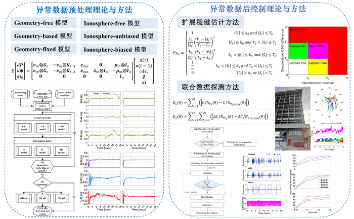 在异常数据准确修复方面,系统研究了复杂条件下GNSS异常数据预处理和后控制的理论与方法。具体包括:给出了面向恶劣观测条件的周跳探测与修复的基本原理和方法,提出了周跳探测与修复的统一化方法,有效解决了小周跳、多周跳、连续周跳、不敏感周跳等处理难题;完善了复杂条件下的粗差识别与处理方法,重点提出了顾及多路径的扩展稳健估计方法,以及考虑验前新息和验后残差的联合数据探测方法,显著改善了多粗差以及系统误差、粗差混叠问题,能使导航定位精度接近于甚至达到理想观测条件下的精度。