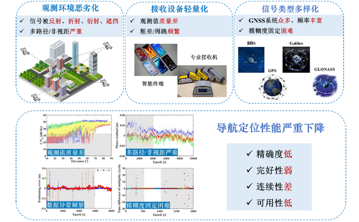 随着北斗卫星导航系统从专业应用扩展到大众市场,其观测条件变得日益复杂,如观测环境恶劣化、接收设备轻量化、信号类型多样化等,容易引起非模型化误差突出、数据质量频繁恶化、数学模型解算异常等难题,难以获得精确可靠的导航定位结果。近期,地学院测绘工程研究所在复杂条件下北斗/GNSS精密导航定位与位置服务理论方法及应用方面取得了一系列研究进展。