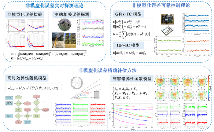 在非模型化误差精细处理方面,系统提出并研究了GNSS非模型化误差处理理论与方法。具体包括:构建了经典的GNSS非模型化误差实时探测理论,检验有效率达到90%以上;提出了GNSS非模型化误差精确补偿方法,重点包括高时效随机模型弹性优化策略以及高容错函数模型弹性调整方案,能使RTK和PPP精度稳定在厘米级甚至毫米级;给出了顾及非模型化误差的GNSS数据质量可靠控制策略,重点提出了几种易于实现的多路径、差分码偏差(DCB)和系统间偏差(ISB)的评估控制方法,有效提升了定位精度和可靠性。