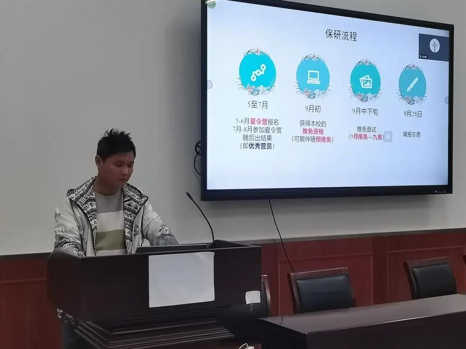 刘殿广同学从前车之鉴、社会工作、成绩为尊、保研加分、科研竞赛、推免流程六个方面进行了分享。刘殿广同学结合自身经历建议大家,要努力学习专业课程,提高绩点,同时要积极参加学科竞赛和各种社会工作,提高自己的综合能力。他向同学们分享保研面试过程中创训方面的一些经验,鼓励同学们积极参加创训,争取获得成果。最后刘殿广同学希望大家不要轻易放弃,在关键的一年时间里努力学习,创新实践,多方面多渠道搜集信息,最后成功去到自己想去的学校。