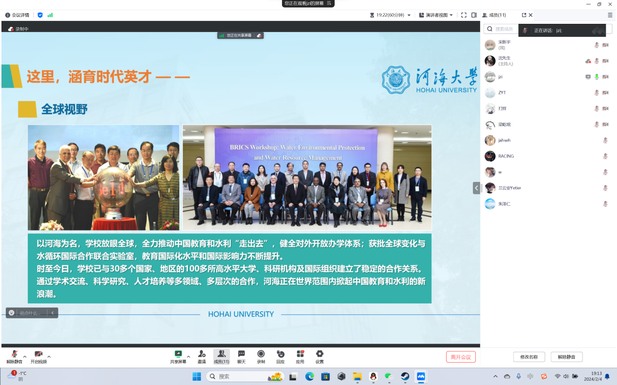 寒潮降临湖北,大雪如注。团队成员原定于2月4日的线下宣讲因学校提前放假而被迫取消。为了不耽误进程,团队成员将线上宣讲提前,于腾讯会议上进行线上宣讲。小组成员——地质工程专业宋新宇、梁屹珉,智慧水利专业贾轹文,里尔学院蔡云嘉,四人有条不紊地组织安排线上宣讲,分工明确。