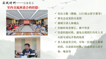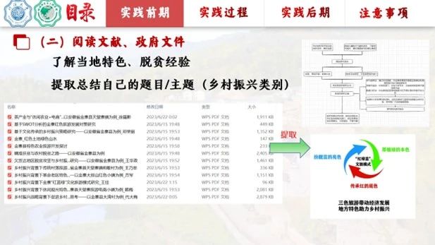 接着,王雨婷同学结合2023年省级优秀团队的实践经历向同学们分享自己的实践经验,她强调,前期在团队人员构成上要尽量做到各有所长、分工明确,另外可以通过检索文献及政府文件的方式确定选题;实践中期注重记录,每天进行复盘及小组讨论,并及时确定每日安排;实践后期方面,就如何撰写通讯稿和总结报告等方面进行了详细说明。