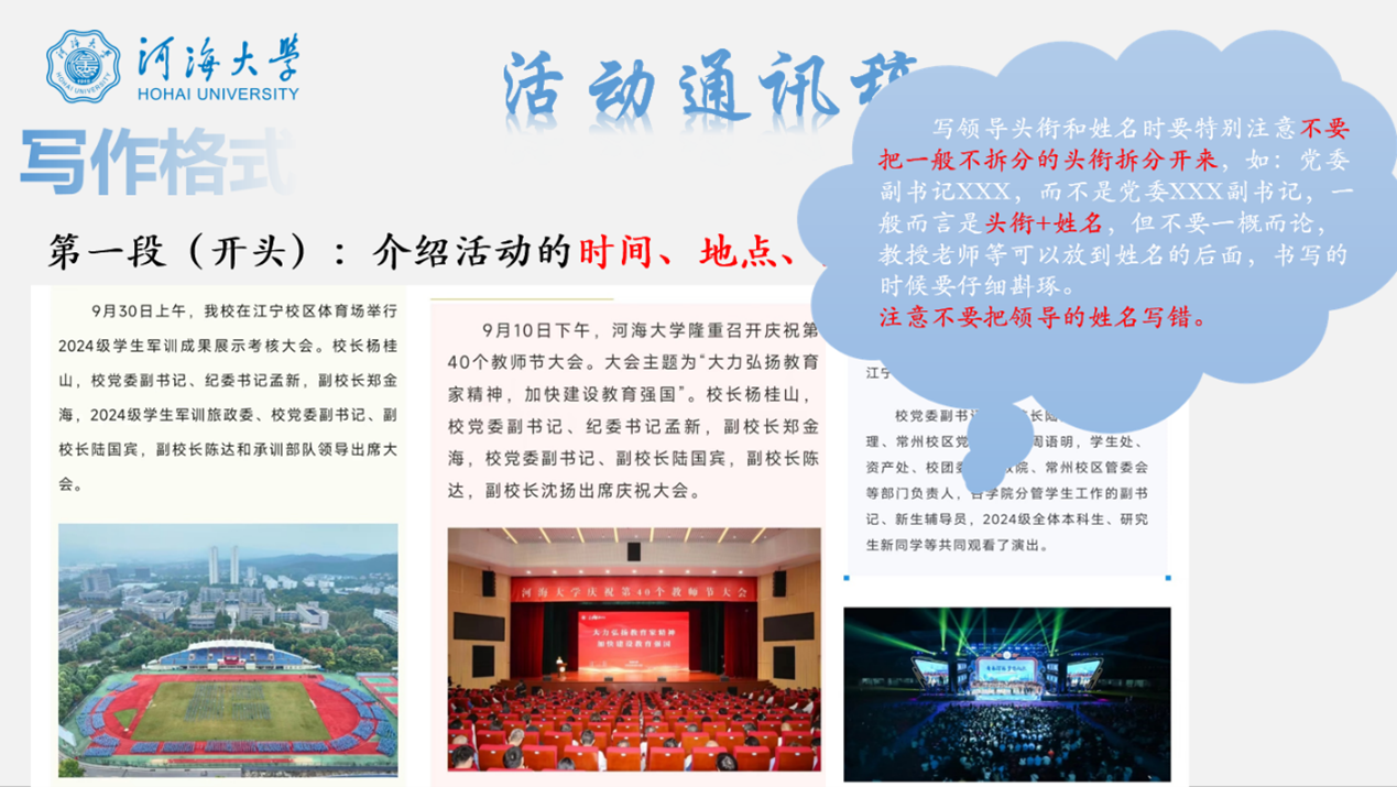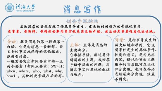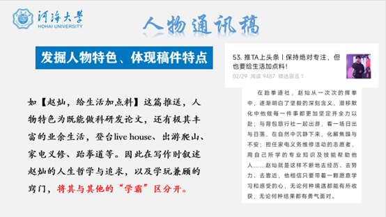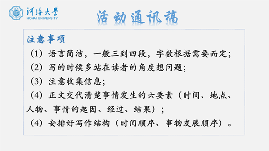 张亦弛系统阐述了消息写作、描写性文字、活动通讯稿及人物通讯稿的写作技巧。首先,他概述了消息写作的四个核心原则:真实准确、新鲜有价值、迅速及时、简明扼要,并通过具体案例分析如何将这些特点融入写作。接着,他讲述了描写性文字的写作方法,强调通过细节描写营造画面感与情感共鸣。最后,张亦弛详细介绍了通讯稿的写作流程,在活动通讯稿的写作中,详细阐述了稿件的写作格式,分别从标题、开头段、正文段、结尾段需要撰写的内容进行了归纳;而人物通讯稿的写作包括事前调查、采访要点、稿件组织与细节润色等,帮助大家掌握了全面的写作技巧。