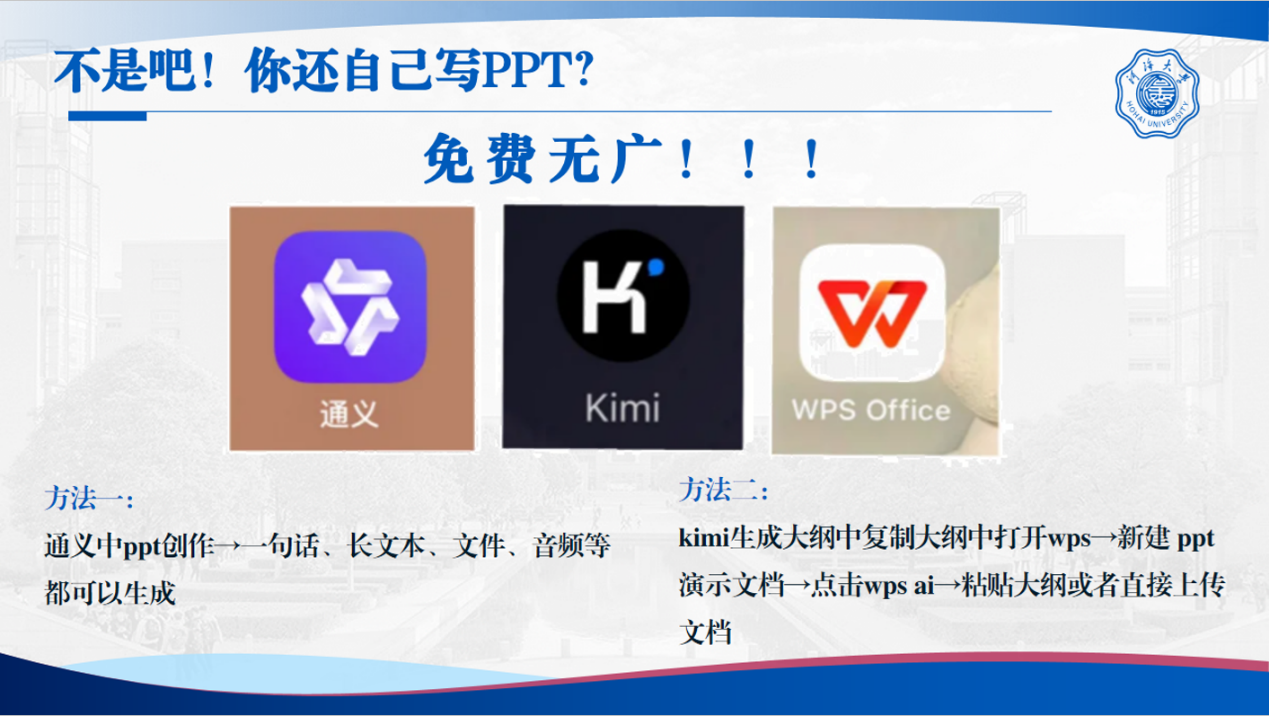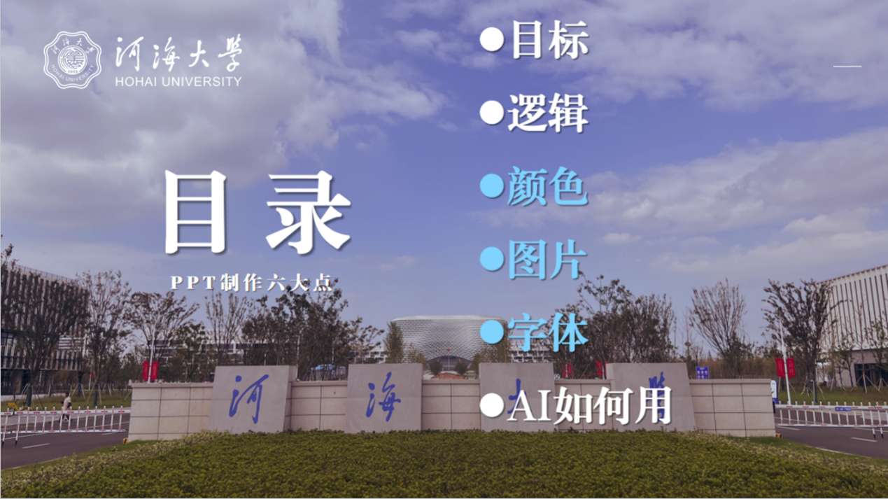 丁朵朵围绕PPT制作的六大要素进行讲解,包括目标、逻辑、颜色、图片、字体以及AI辅助应用。首先她明确演示目标是成功的第一步,PPT逻辑要清晰易懂,层次分明并提出“内容不在多,贵在精当;色彩不在多,贵在和谐;动画不在多,贵在需要”。她建议配色方案应符合主题氛围,同时分享多种常用配色方法供大家学习参考。字体需简洁规范,注意大小和行间距,以增强阅读性。此外,她还介绍了如何使用AI工具高效制作PPT,帮助同学们在时间有限的情况下提升演示效果。通过这些实用建议,同学们对PPT制作有了更全面的理解与掌握。
