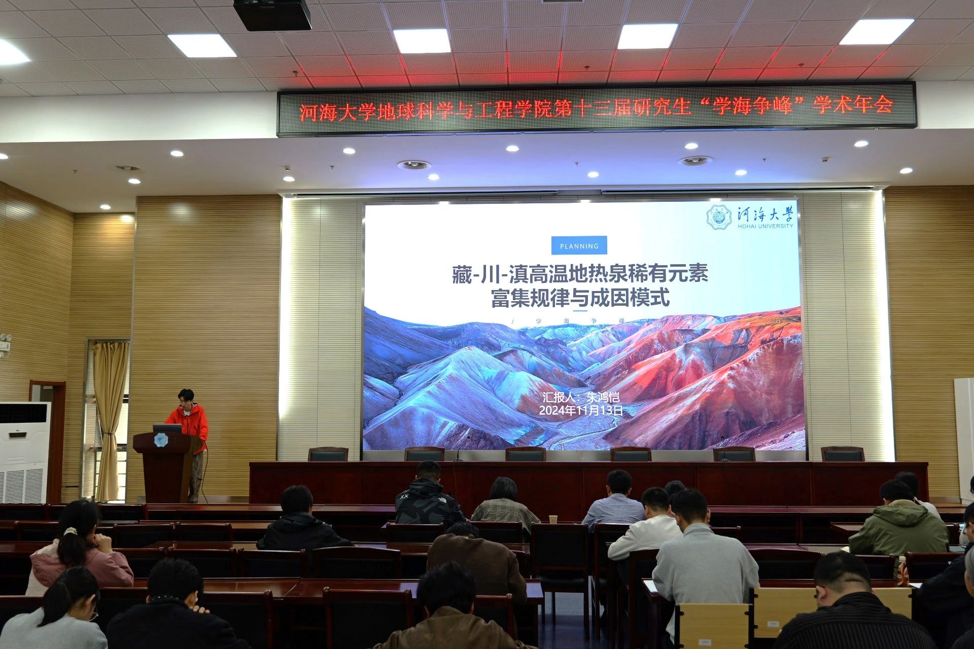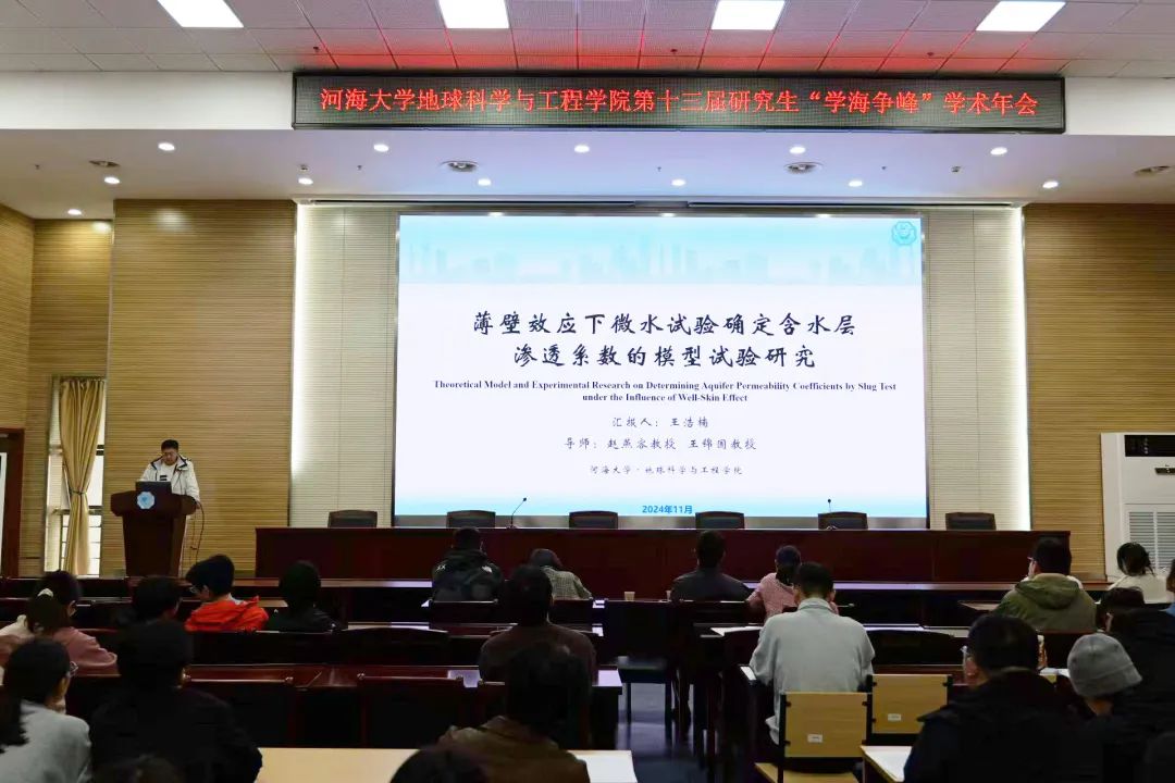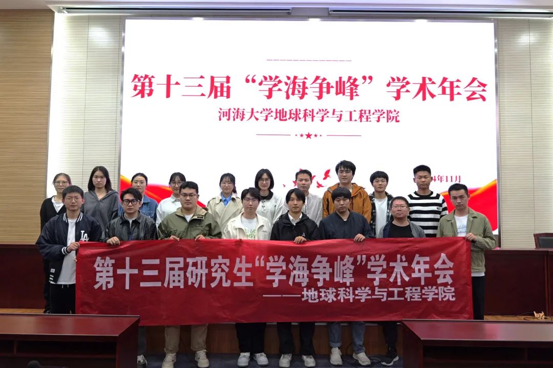 河海梧桐行秋晚,落日偏傍学窗明,为塑造积极的科技创新精神,营造浓厚的校园学术氛围,充分整合科研力量和利用学术资源,增强研究生的创新科研意识,不断提高研究生参与学术交流的能力,11月15日下午,地学院于笃学楼208举办第十三届研究生“学海争峰”学术年会。