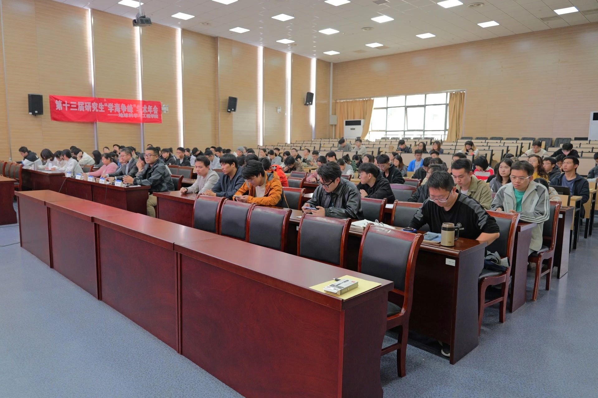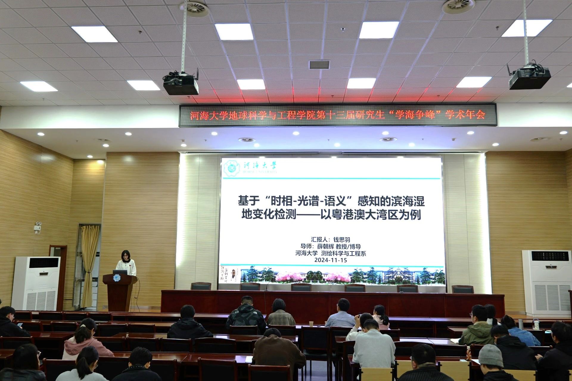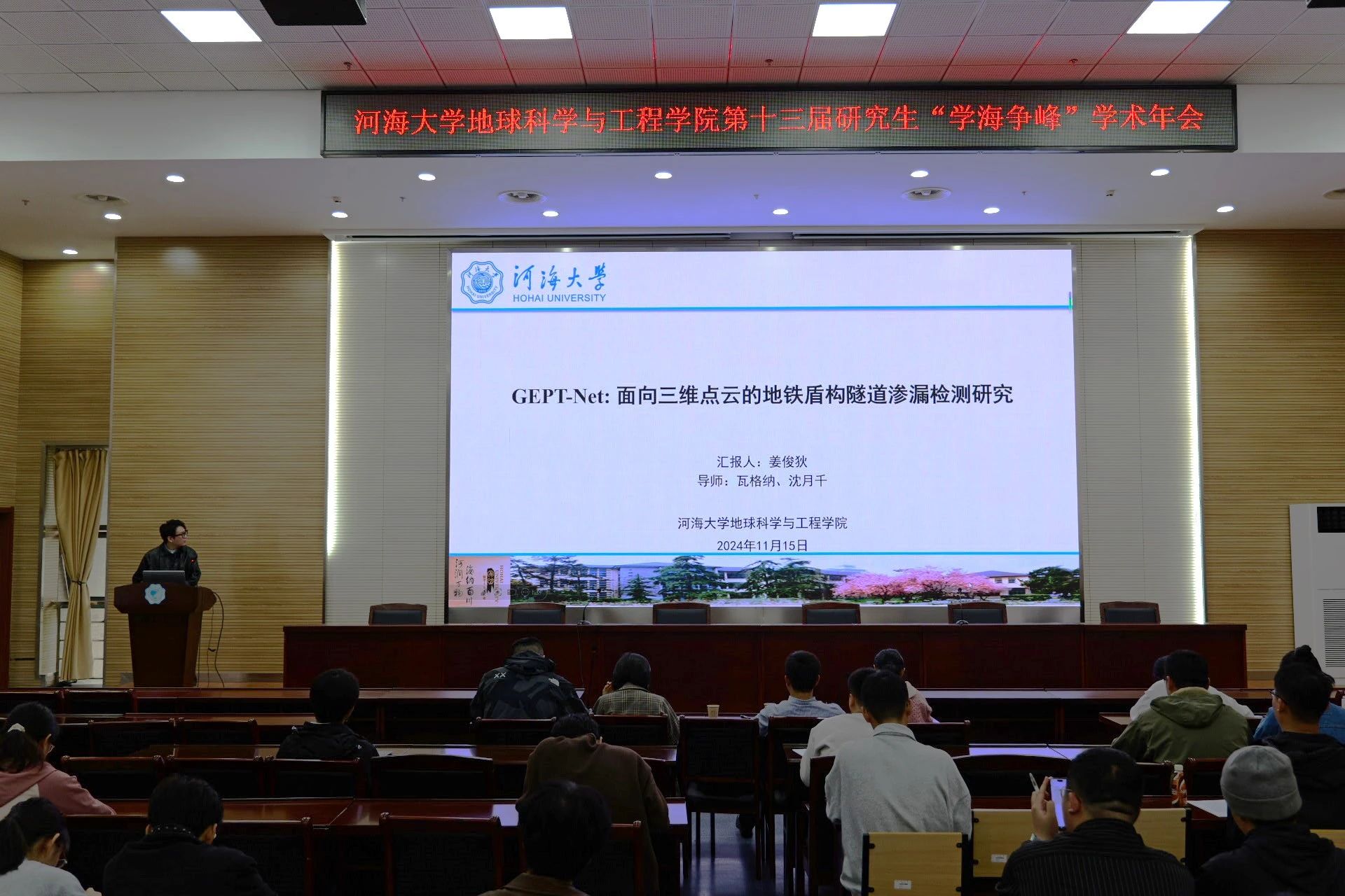 河海梧桐行秋晚,落日偏傍学窗明,为塑造积极的科技创新精神,营造浓厚的校园学术氛围,充分整合科研力量和利用学术资源,增强研究生的创新科研意识,不断提高研究生参与学术交流的能力,11月15日下午,地学院于笃学楼208举办第十三届研究生“学海争峰”学术年会。