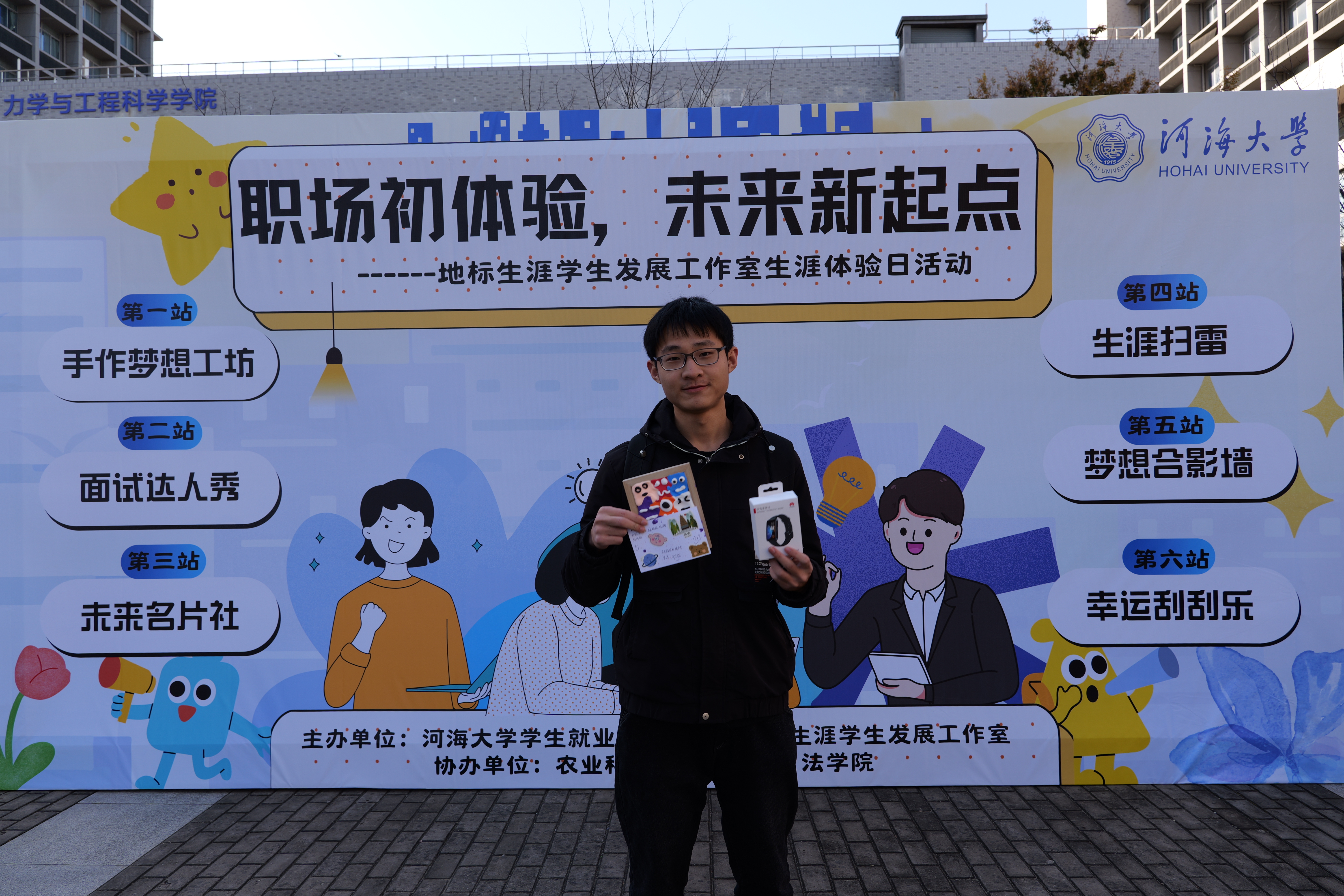 活动的最后是令人期待的抽奖环节,为完成所有关卡并集齐印章的同学提供了参与抽奖的机会。奖品丰富多样,包括华为手环、凌美钢笔、充电台历、SKG按摩仪、文创笔记本、精美书签便利贴等实用好物。同学们热情高涨,现场洋溢着欢声笑语,为大家的生涯体验之旅画上了一个圆满的句号。