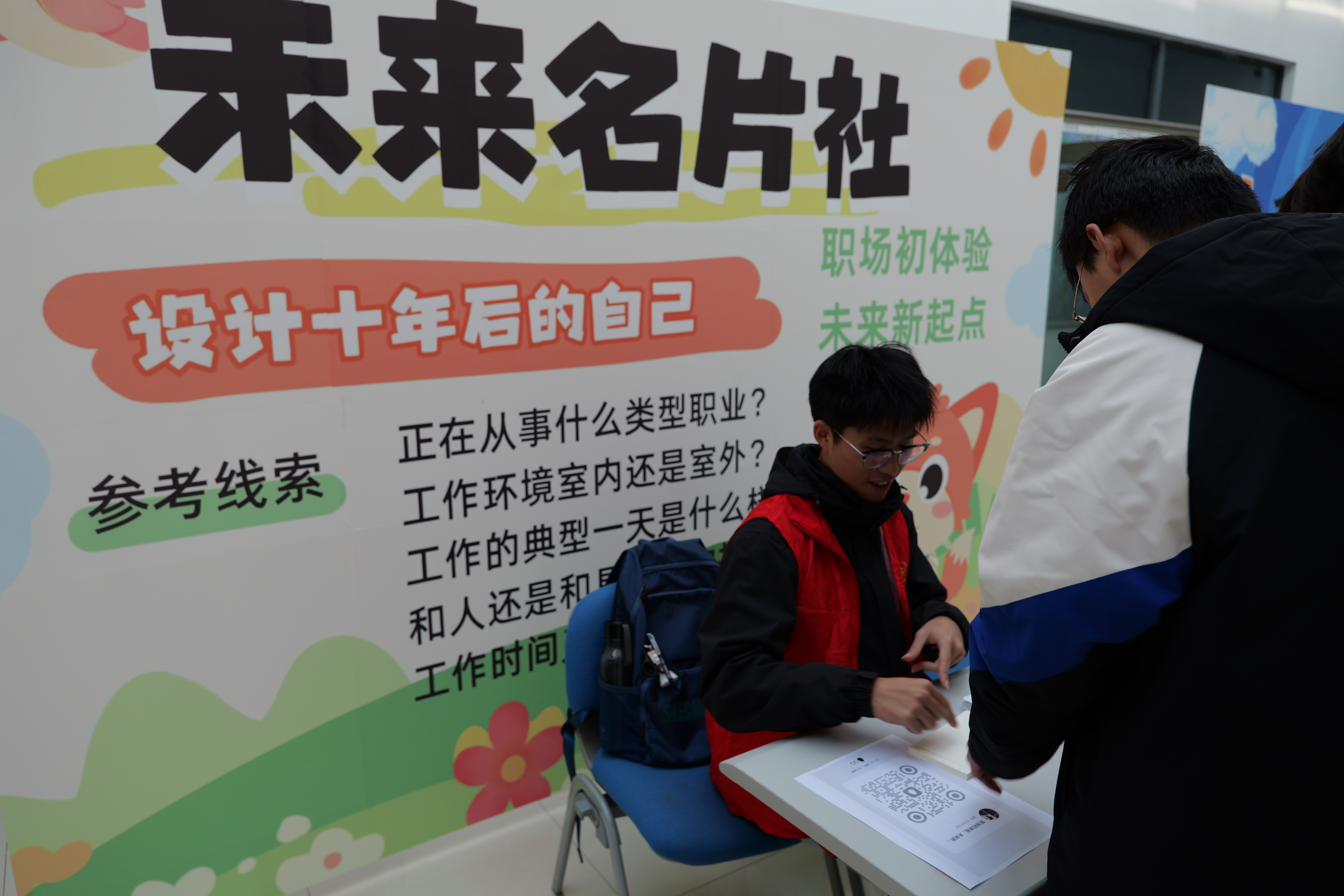 “未来名片社”里,同学们设计属于自己的未来名片,从职业头衔、兴趣特长,再到个人职业目标,在构思与分享中深化了职业自我定位的意识。