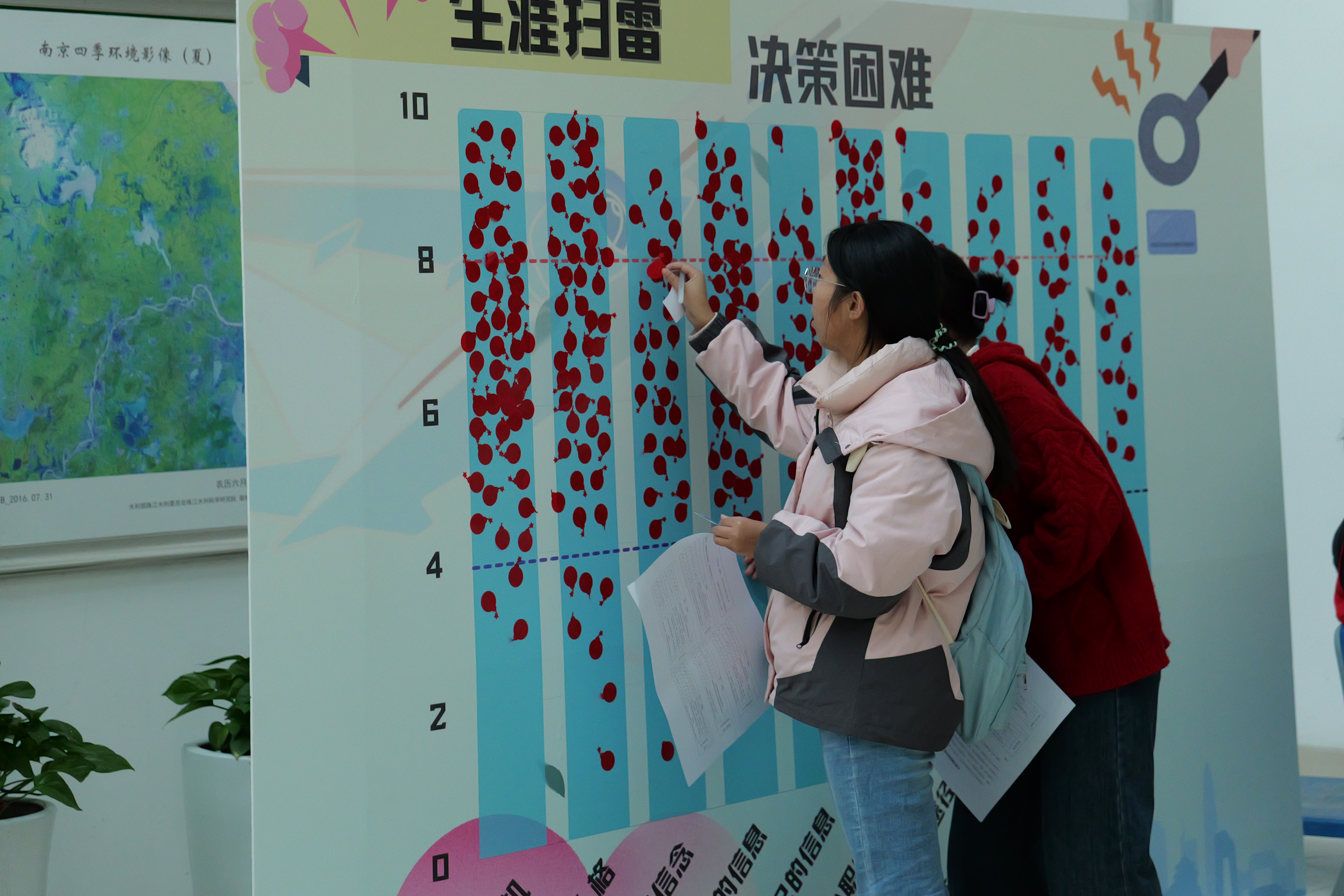 “生涯扫雷”环节中,同学们通过专业问卷识别生涯“雷区”,全面洞察自己的职业决策难点,用贴纸标记在决策困难板上,明确自己在职业发展道路上的短板,扫清未来规划的障碍。