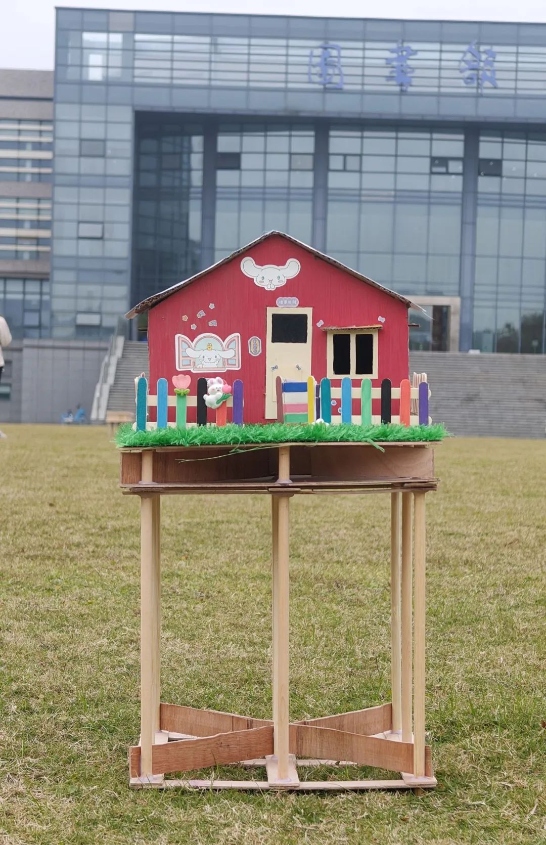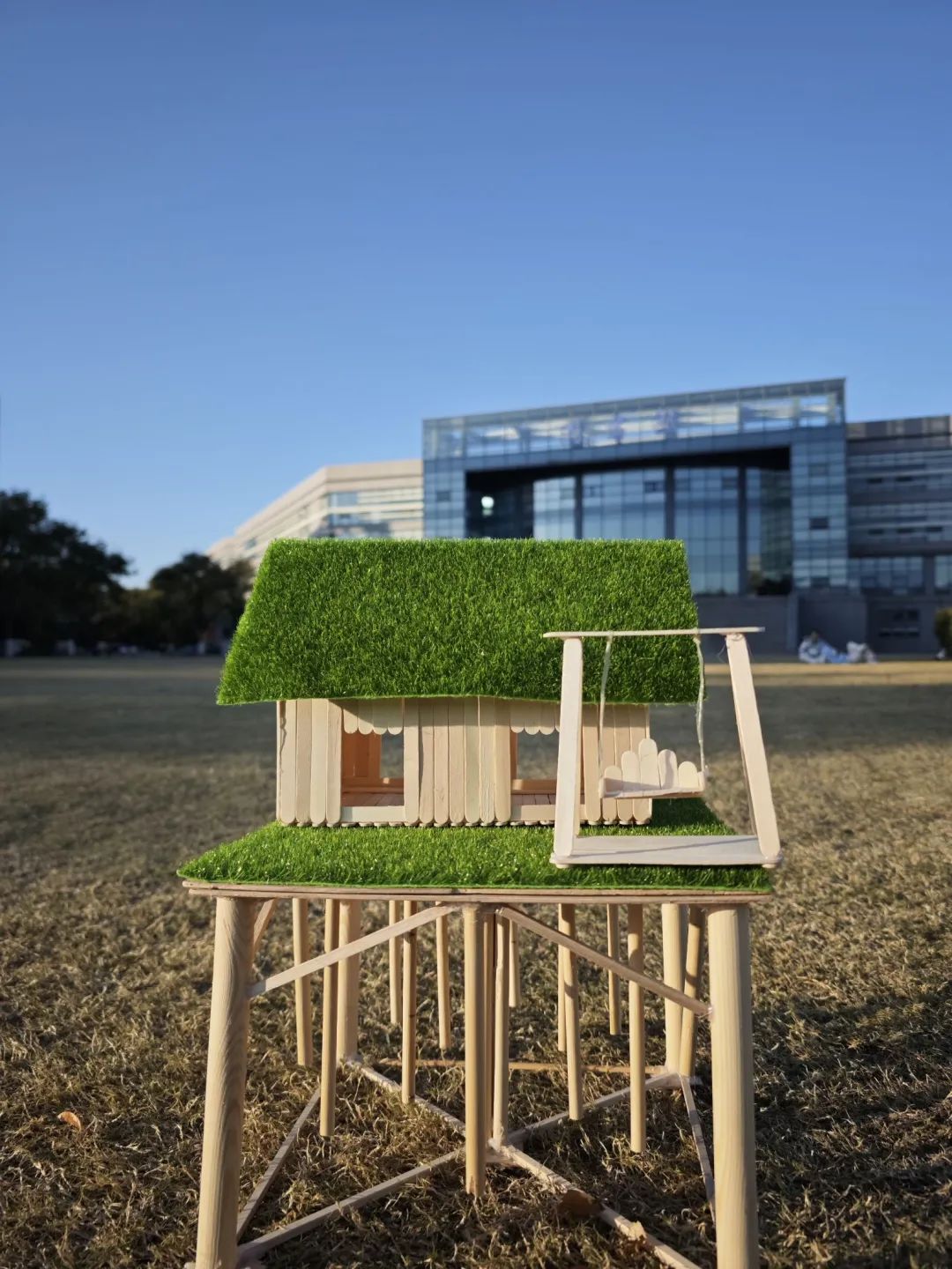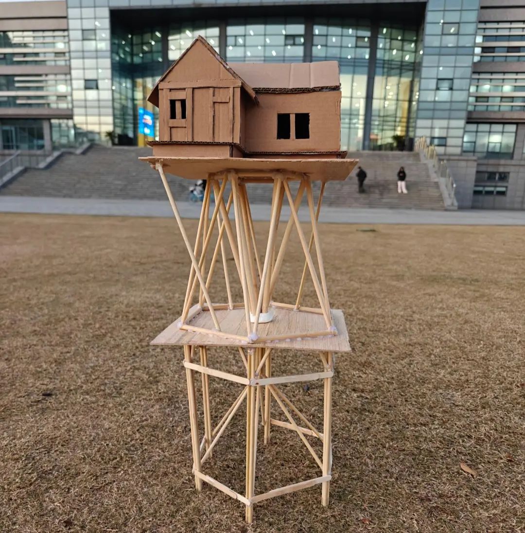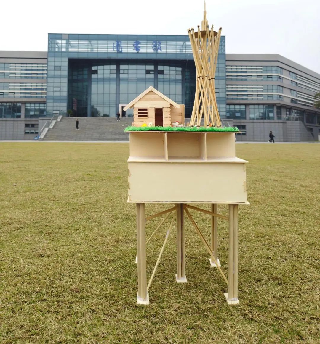 该组模型主要针对四川等地震区,整体分为三部分,第一部分下部地基主要以“田”字条形基础,榫卯结构和梅花桩组成。第二部分上部地基主要用来加固提高地基并二次使用榫卯结构。第三部分整体结构采用九根柱子从头到尾打入地基土中来提高地基整体,并运用型钢混凝土代替,以提高承载能力和抗震性能。创新点:“田”字条形基础。