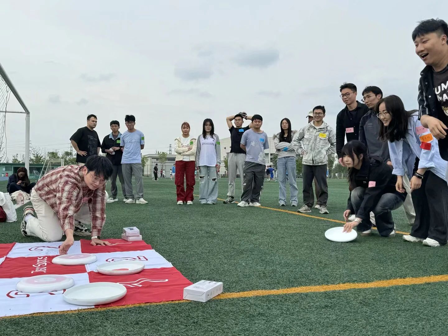 户外活动在东操场开展,此次共有飞盘接力、飞盘魔毯两个活动。工作人员首先为参与者讲解飞盘运动规则,带领全员完成趣味热身操。正式比赛环节,45名同学被分为六支队伍,队员统一佩戴彩色名牌标识分组。赛场上,队员们默契配合,既有精准长传的惊艳瞬间,也有失误后互相鼓励的暖心画面。