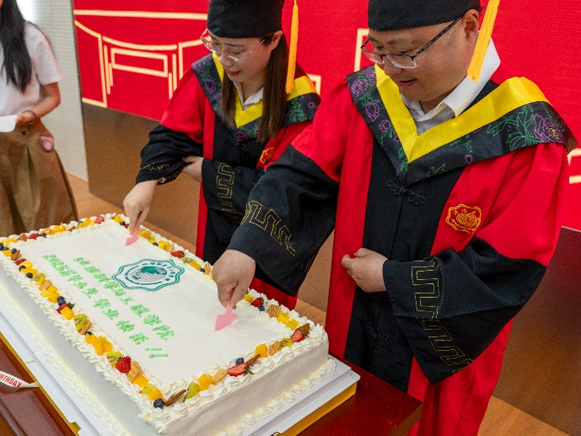 毕业典礼上,马孟珂书记和刘瑾经理为毕业生切发毕业蛋糕。
