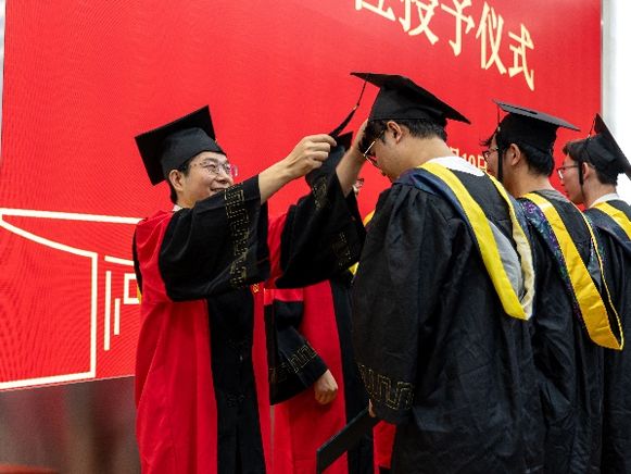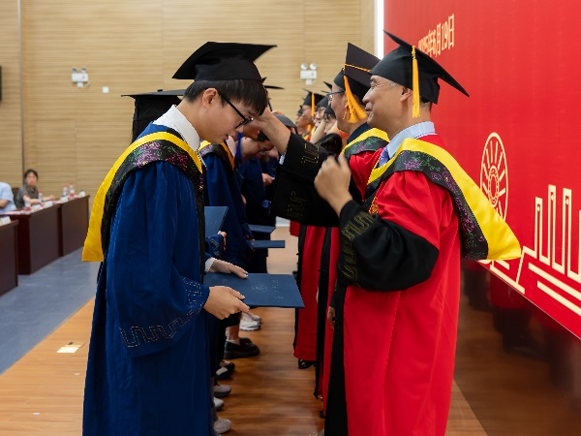 毕业典礼上,地学院学位评定分委员会老师为毕业生拨穗并颁发毕业证书及学位证书。
