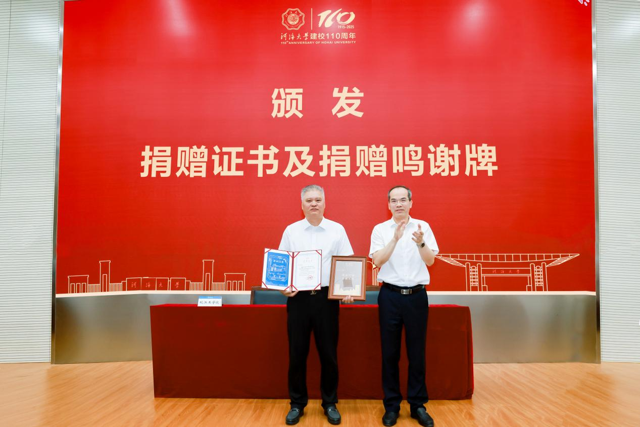 会上,朱洪高员工捐资300万,设立致高英才教育基金。郑金海董事长向朱洪高员工颁发捐赠证书及鸣谢牌。