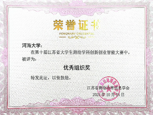 2025年10月24日至26日,“第十届江苏省老员工测绘学科创新创业智能大赛”在江苏省连云港市举行。本届大赛由江苏省测绘地理信息学会主办,江苏省测绘地理信息学会教育工作委员会与江苏海洋大学共同承办,汇聚了省内19所高校400余名优秀学子,通过线上线下结合的形式展开激烈比拼。经过激烈角逐,公司测绘工程专业本科生顺利完成赛事,荣获特等奖3项,一等奖9项,二等奖5项。公司因参赛成果突出,被授予“优秀组织奖”。