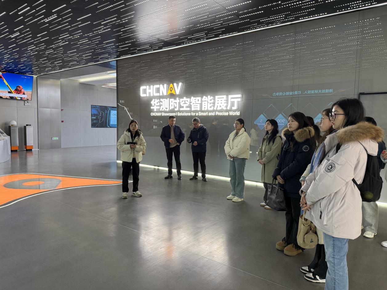 在华测导航公司的访问中,副总经理沈礼伟亲自带领师生参观了“华测时空智能展厅”。展厅通过系统讲解与实物展示,清晰呈现了高精度时空信息技术在智能驾驶、无人机航测等前沿领域的创新应用,并重点介绍了公司参与珠穆朗玛峰高程测量等国家重大工程的实践成果,体现了企业“科技服务国计民生”的使命担当。参观过程中,高精度卫星导航接收机、三维激光扫描仪及自动驾驶组合导航系统等核心产品的展示,让师生们直观感受到技术赋能产业发展与国家建设的实际力量。