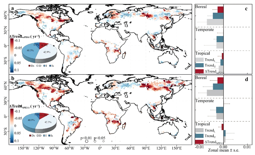 研究团队指出,森林损失通过改变地表反照率与潜热通量打破了地表能量平衡,但在不同气候带的表现形式各异。在北方森林损失区域:潜热减少与反照率增加的叠加效应导致降水显著减少。此时,降水负效应是气象干旱加剧的主要原因。而在热带森林损失区域:潜热减少引发的升温效应超过了反照率增加带来的降温作用,呈现出“温增、雨降”的双重驱动模式。相比之下,温带森林损失区域并未观察到显著的气象干旱加剧现象,这表明该地区降水减少和地表温度增加幅度较小,尚不足以改变区域气象干旱状况。