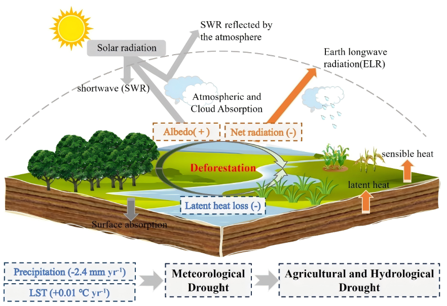在全球变化驱动的水文循环演变背景下,森林作为陆地生态系统的核心,其覆盖变化对全球水分再分配具有深远影响。近日,betway西汉姆联吴太夏教授领衔的水资源环境遥感研究团队,在《Science Advances》发表题为“Forest loss intensifies meteorological drought in over half of Earth’s climate zones”的研究成果。该研究首次系统性地评估了全球森林损失对不同气候带气象干旱的影响,并揭示了其背后的陆-气相互作用反馈机制(图1)。