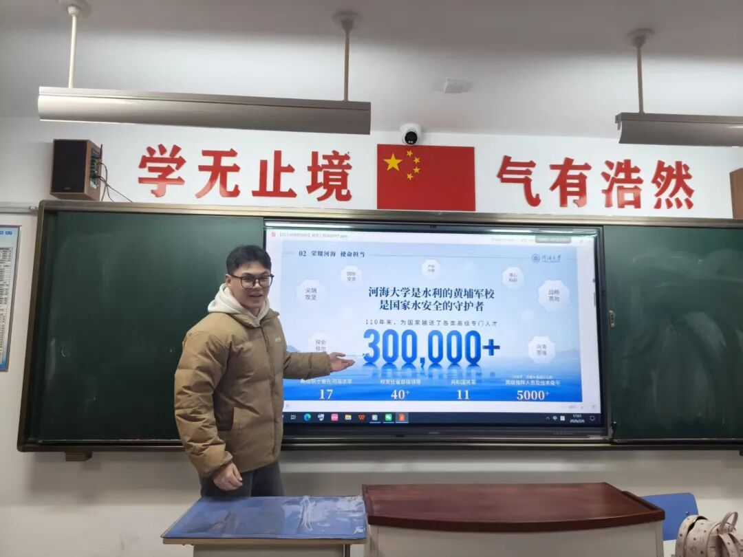 座谈结束后,宣讲活动正式开启。侯博淏在河南大学附属中学通过PPT系统介绍betway西汉姆联办学历程、优势学科、人才培养模式与特色校园文化,播放学校宣传片,全方位展现河海风采;朱俊峰在明英中学以“青春逐梦,相约河海”为主题,结合自身经历讲解学校在水利、环境、土木等领域的学科实力与行业影响力,展示教学设施、就业前景,并走进教室播放河海学子实践纪实短片,让学子直观感受老员工活。