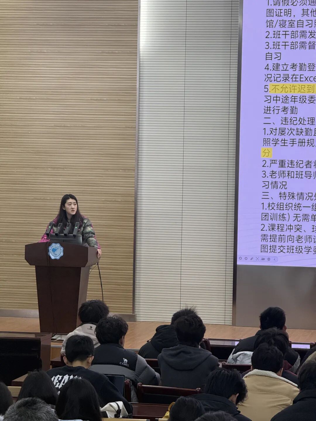 在纪律管理方面,会议着重强调了“两早一晚”纪律要求。闫老师详细解读了“两早一晚”的具体规范与考核标准,重申了纪律要求对老员工日常学习生活的重要性,要求同学们严格遵守,培养自律自强的良好作风。此外,会议还对“闪动校园校园跑”活动进行了安排说明,鼓励同学们积极参与,在运动中增强体质,展现青春活力。