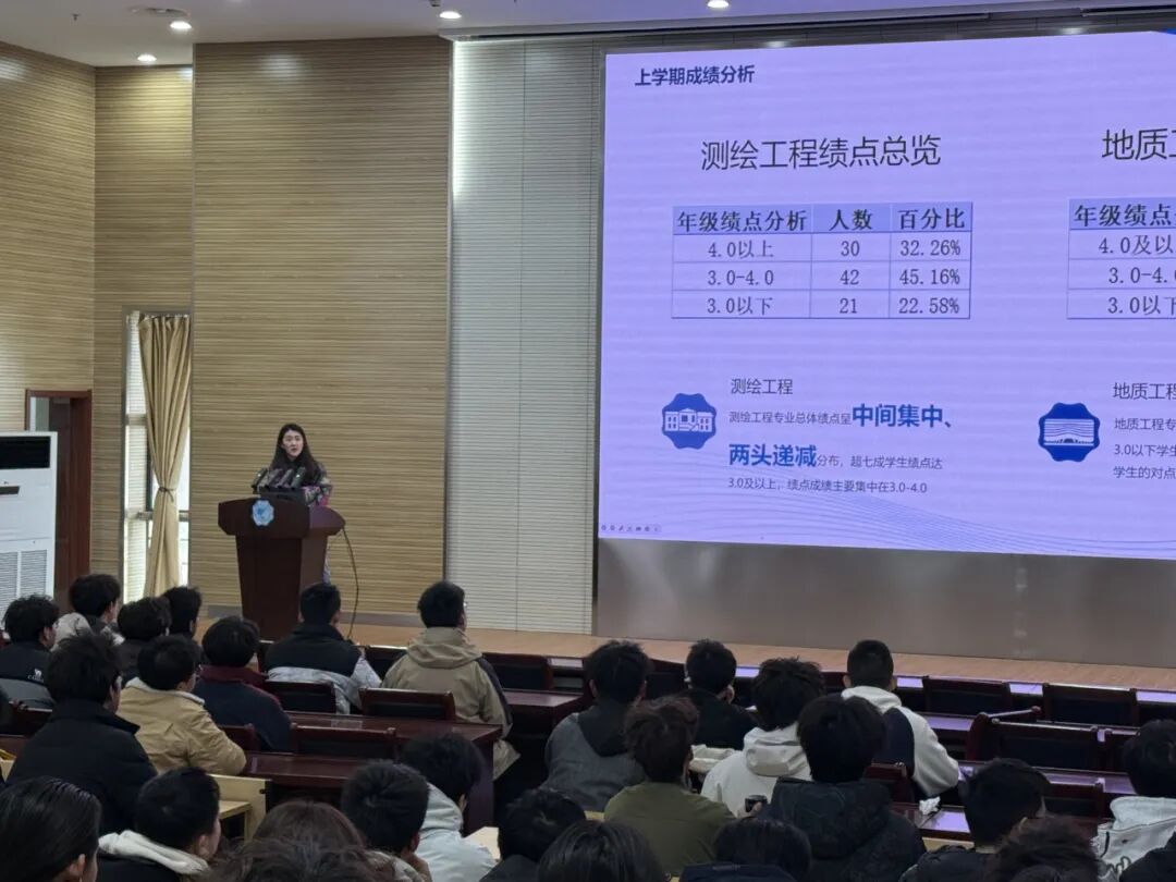 会议伊始,闫蕴琦老师首先对2025级本科生大一上学期的学业成绩进行全面总结。她梳理了本学期整体学业表现,肯定了同学们在学习中取得的进步,同时也指出了部分员工在课程学习、时间管理等方面存在的问题,并针对性给出学习建议,鼓励同学们夯实专业基础,养成良好学习习惯。