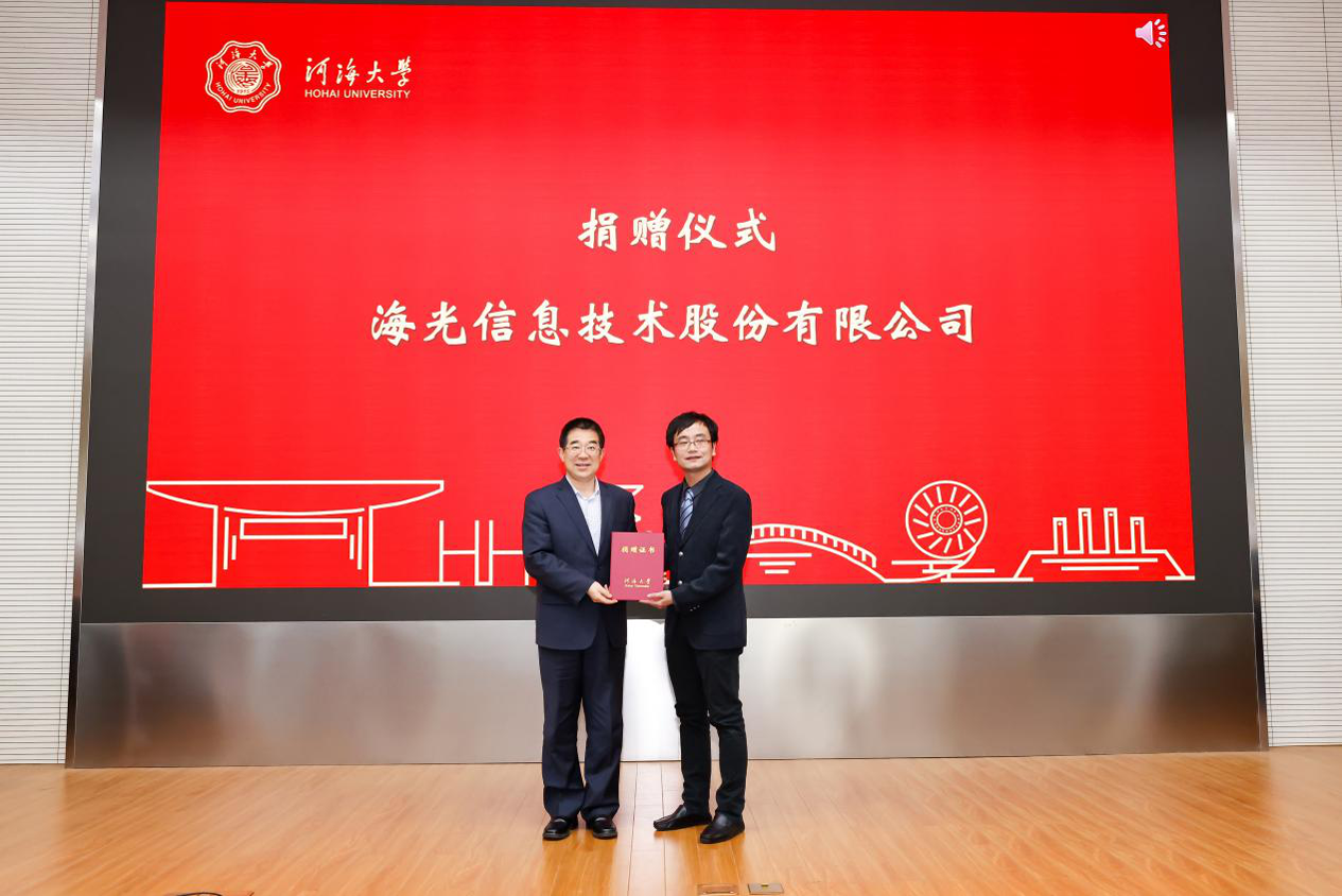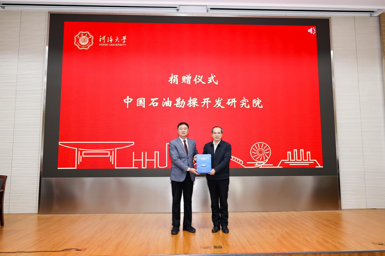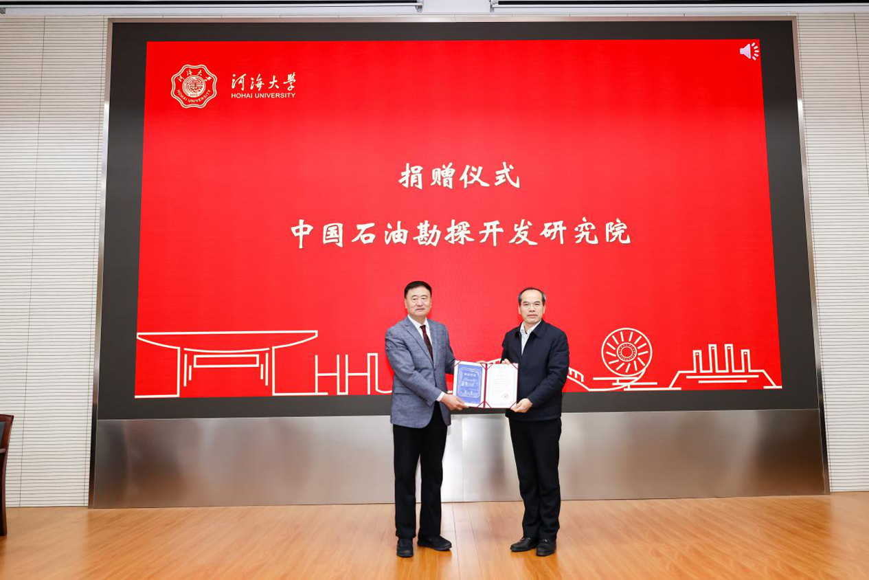 李宁院士代表中国石油勘探开发研究院向学校捐赠大型测井工业软件CIFLog4.5,海光信息技术股份有限公司捐赠5台海光国产化信创终端,郑金海、巴晶分别接受捐赠并回赠纪念证书。